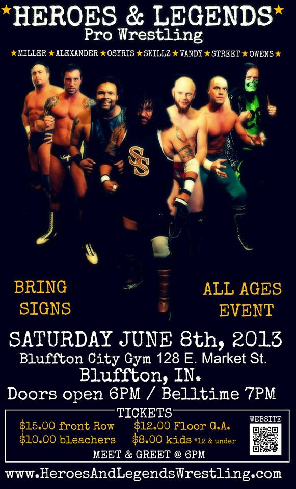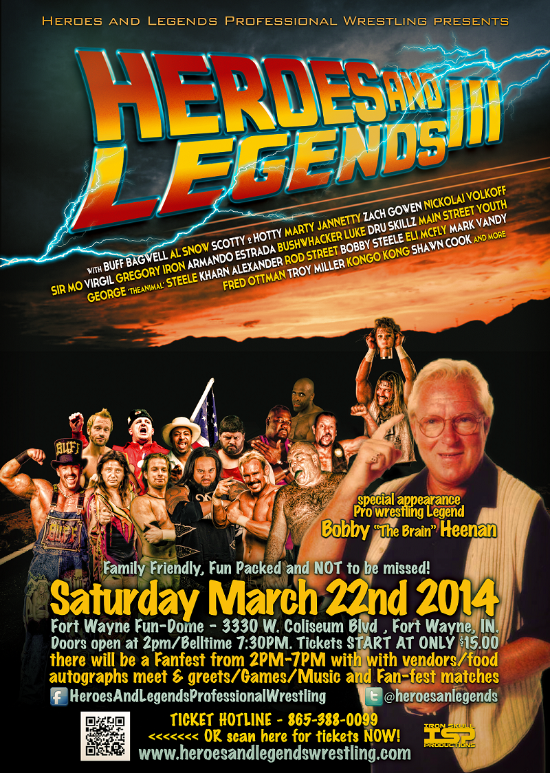 Saturday, March 22, 2014"Heroes & Legends III" Fort Wayne Fundome Jayson Maples came out to the ring to talk about Nelson Frazier and brought out Men On A Mission Mo & Oscar who also speak about their friend and brother. A 10 bell salute was rung in honor and a video package was shown as a tribute to Mabel. * Mike King came to the ring talking about all the legends, then claimed the best thing about the show was that no one would have to hear Oscar rap tonight... which prompted Oscar and Mo to come to the ring.. * Mo beat Mike King Mike King got back on the mic and claimed that he was not ready for that match and he can beat anyone at any time... Jessie Godderz came to the ring... * Jessie Godderz beat Mike King * Shawn Cook & Dylan Bostic beat Appollo Starr & Remi Wilkins & Chuck Weeden & James Rampage in a 3 way tag match * Buff Bagwell beat Troy Miller * Kongo Kong w/ Armando Alejandro Estrada beat Mark Vandy * Roderick Street beat Bushwhacker Luke * Bobby Steele beat Nikolai Volkoff * Scotty 2 Hotty beat Kharn Alexander with Kenzi Alexander * Marty Jannetty beat Eli Mcfly * HLW Tag Team Championship: Jake Omen & Scotty Young (c) beat Zach Gowen & Gregory Iron to retain the title * HLW Champonship: Dru Skillz (c) beat Al Snow to retain the title