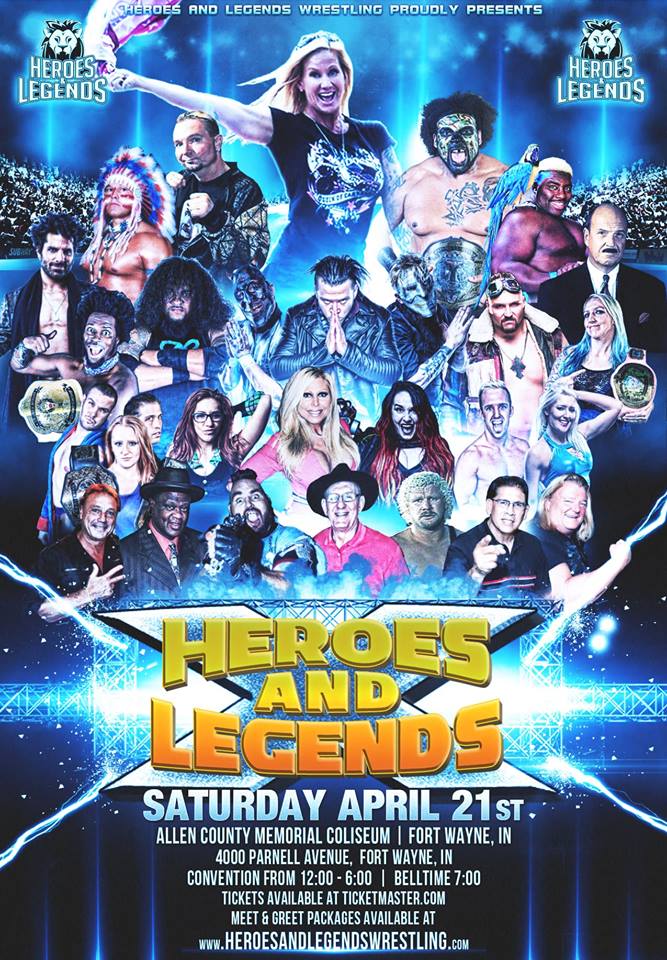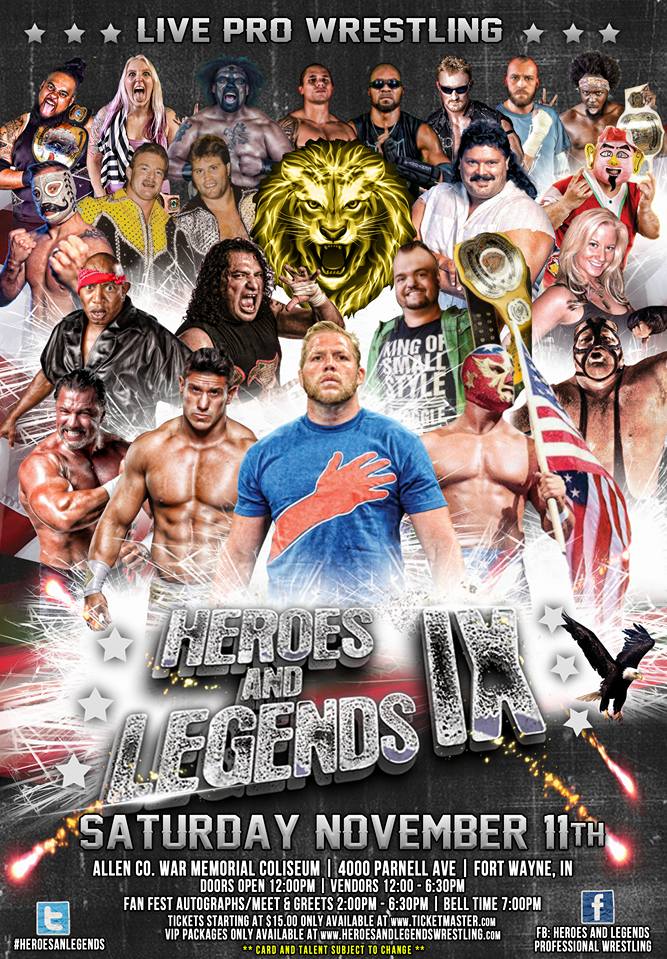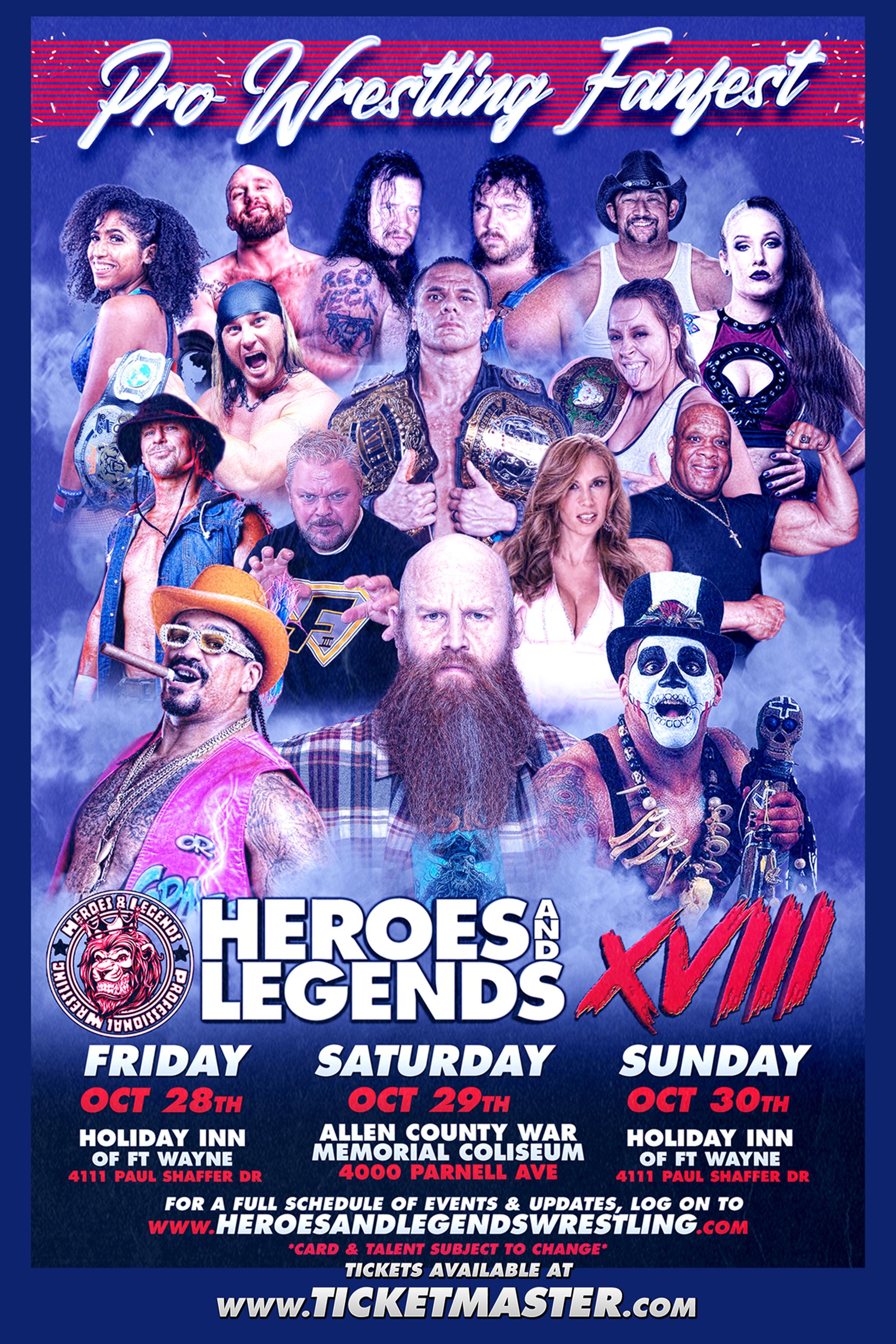 Heroes & Legends Wrestling XVIII Saturday, October 29, 2022 Allen County War Memorial Coliseum Fort Wayne, IN. * David Ali def. Blaqtus Jack * Myron Reed def. TGA Moss * 30 man battle royal (for a title shot)