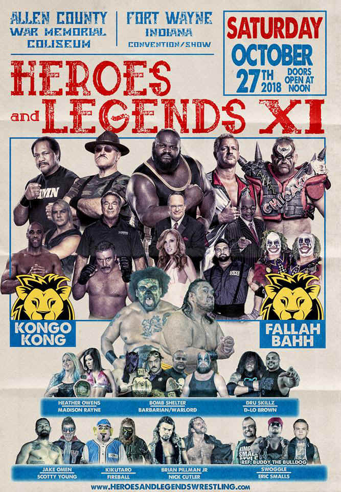 Heroes & Legends Wrestling XI * Russ Jones won a battle royal * Human Tornado beat Sean Casey * Fireball beat Kikutaro * Jake Omen beat Scotty Young * HLW Legends Championship: D'Lo Brown beat Dru Skillz to crown the first champion * HLW Mini's Championship: Eric Smalls beat Swoggle (c) to win the title after guest referee Buddy The Bulldog interfered Jim Cornette conducted an in ring interview with Brian Pillman Jr. Nick Cutler interrupted and physically assaulted Cornette. Pillman ended up hitting Cutler with Cornette's tennis racket. * HLW Women's Championship: Heather Owens (c) beat Madison Rayne to retain the title * HLW Cruiserweight Championship: Sugar Dunkerton (c) beat Nick Cutler to retain the title * Powers Of Pain (Warlord & Barbarian) beat HLW Tag Champions The Bomb Shelter (Joseph Schwartz & Zodiak) in a non title match * HLW Title: