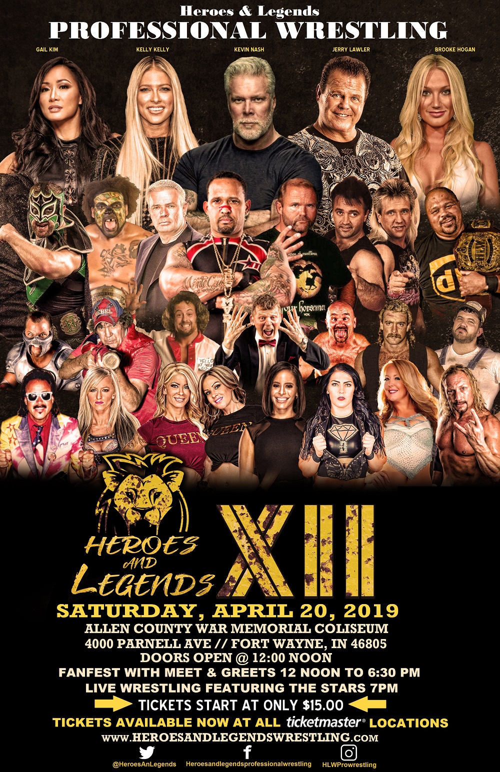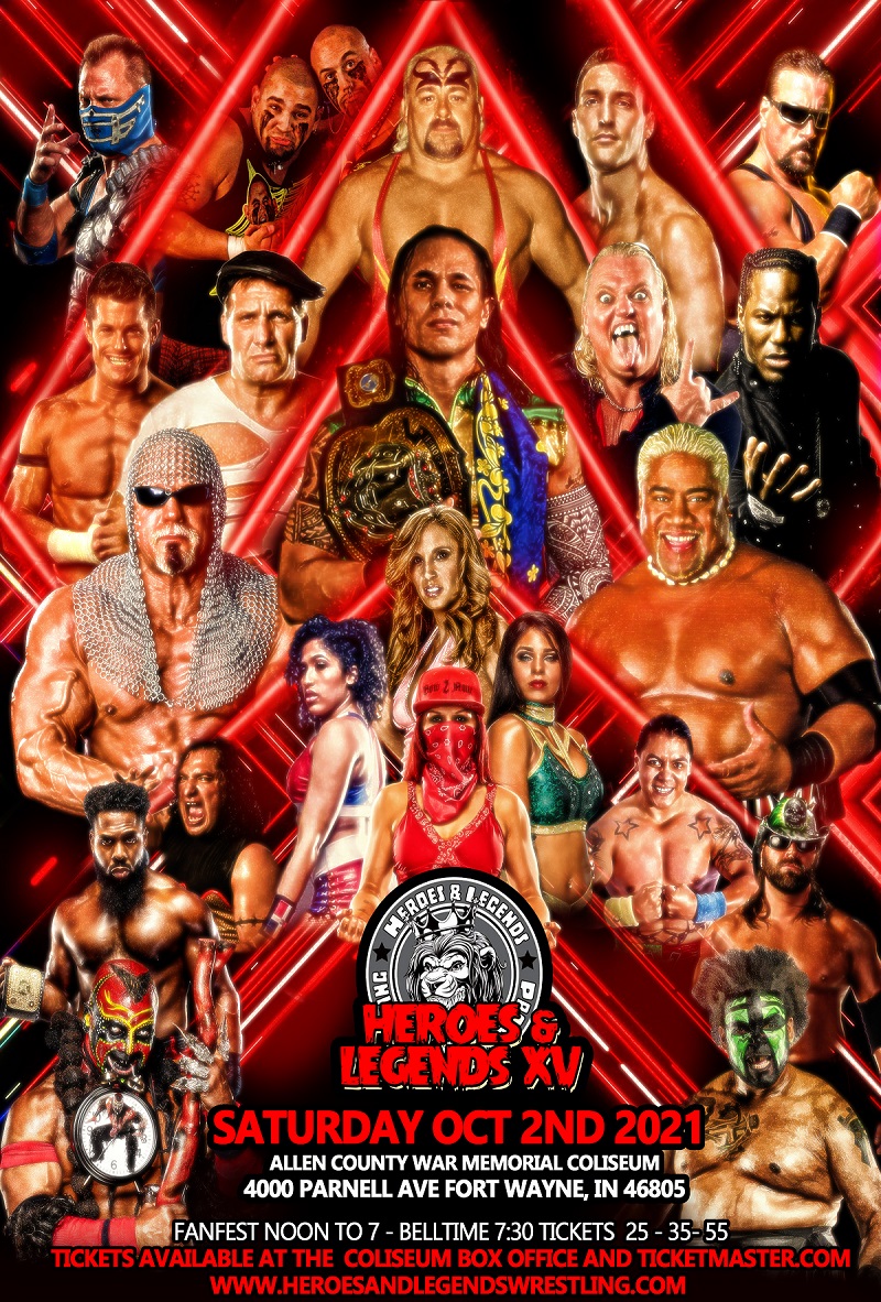 Heroes & Legends Wrestling XV October 2, 2021 Allen County War Memorial Coliseum Fort Wayne, IN. Show opened up with Owner Jayson Maples coming out to welcome the crowd. Brad Luzadder sang the National Anthem. Adam Hart performed his single "Heroes and Legends" Dru was originally to face Gangrel who was injured and hand picked his replacement Kongo Kong The finish saw Juventud Guerrera come down the ramp in a wheel chair which distracted Super Crazy.... Cody Lee scored the win.... Crazy and Juvi... got into a verbal argument and a challenge was made for HLW XVI Marti Belle scored the pinfall, then cash in by MISSA KATE * HLW WOMEN’S CHAMPIONSHIP |