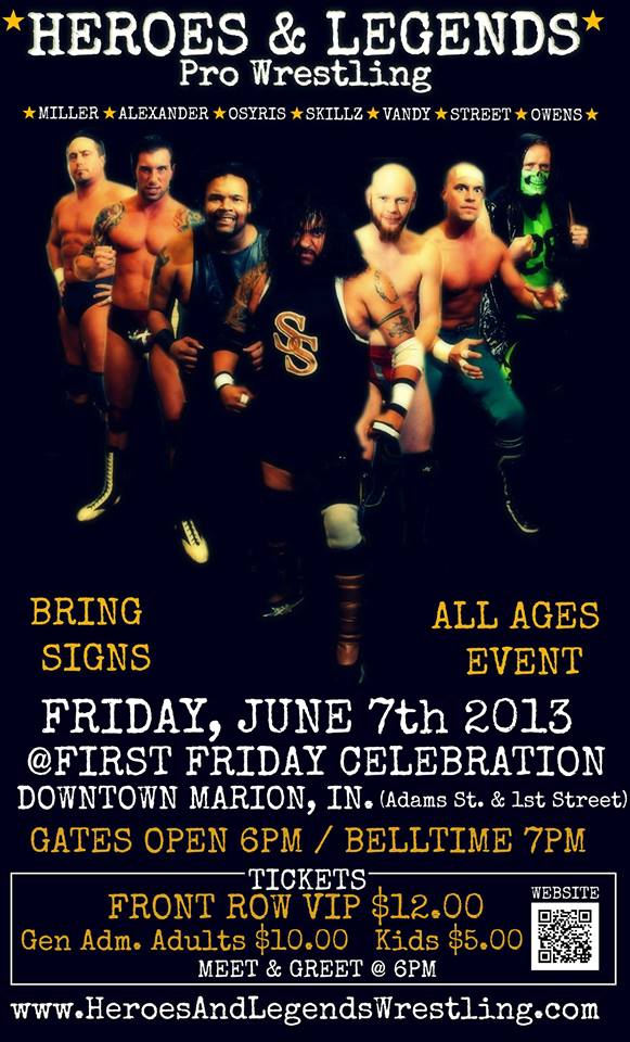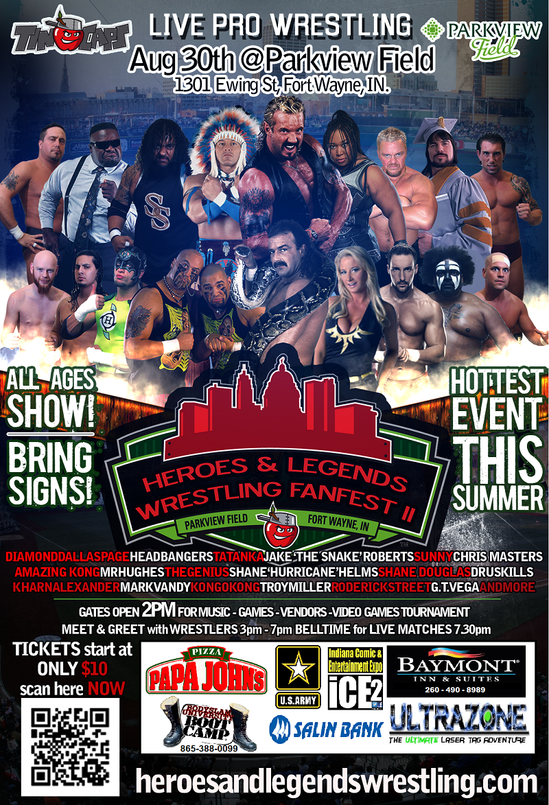 Friday, August 30, 2013"Heroes & Legends II" Parkview Field Fan Fest Matches: * Chuck Weeden beat Rampage * Eli McFly beat Gabriel Grey * Russ Jones beat Xavier Justice and Mike King * Darrell Jackson beat GT Vega * Roderick Street beat Shawn Cook Main Show: * Kongo Kong & Awesome Kong beat Joseph Schwartz & Randi West * Shane Douglas w/ Sunny beat Troy Miller w/ Miss E-Liz * Chris Masters beat Kharn Alexander w/ Kenzi * HLW Tag Team Championship: Main Street Youth (Jake Omen & Scotty Young) beat The Headbangers (Mosh & Thrasher) to become the first ever champions * "Hurricane" Shane Helms beat Mark Vandy * HLW Championship: Tatanka beat Dru Skillz (c) by DQ