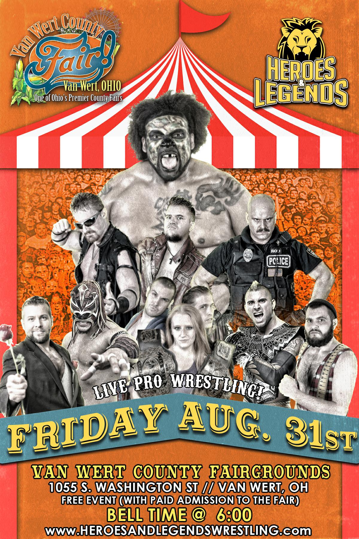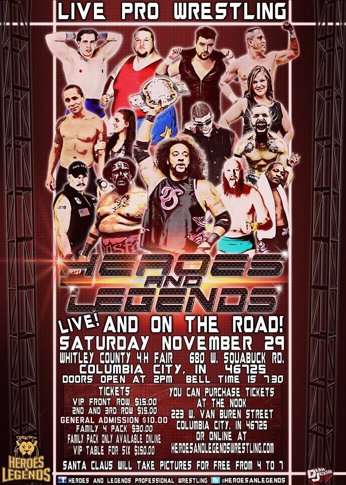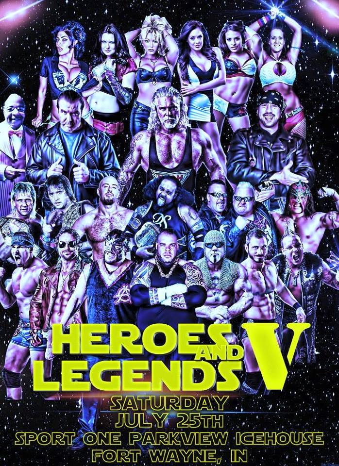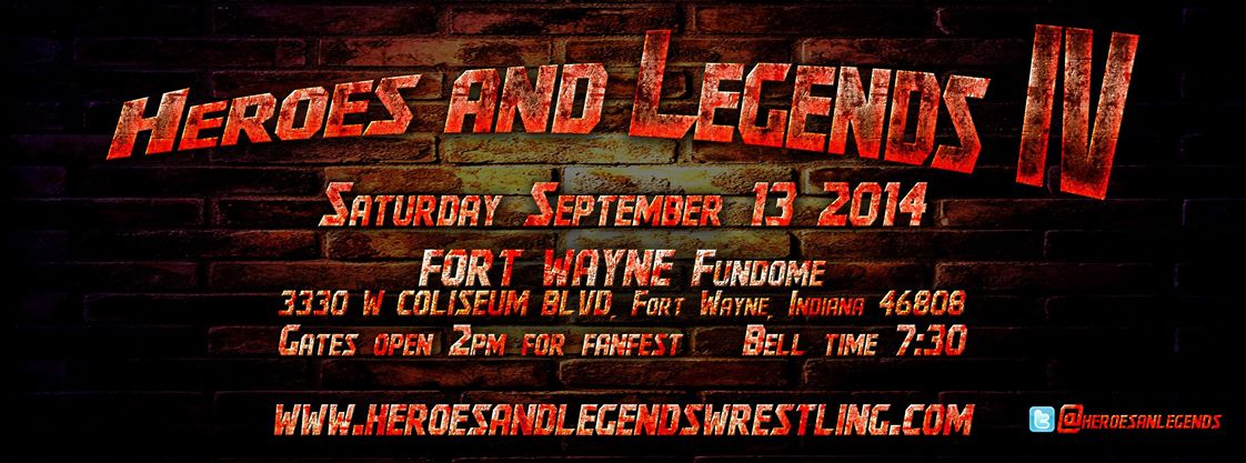 Saturday, September 13, 2014"Heroes & Legends IV" Fort Wayne Fundome * Great Aukuma beat Jun Hado Sabu came out and dropkicked a chair into Hado's face. * Anthony Toatele beat Roderick Street, Eli McFly, and Alexander S Kirk in a 4 way dance * Gangrel beat Kongo Kong * HLW Tag Champions Jake Omen & Scotty Young with Mark Vandy beat "the bWo" Stevie Richards, Nova, & The Blue Meanie * Bob Holly beat Kharn Alexander * Sugar Dunkerton beat Tracy Smothers * Russ Jones beat Tommy Dreamer * HLW Championship: Dru Skillz (c) beat Carlito