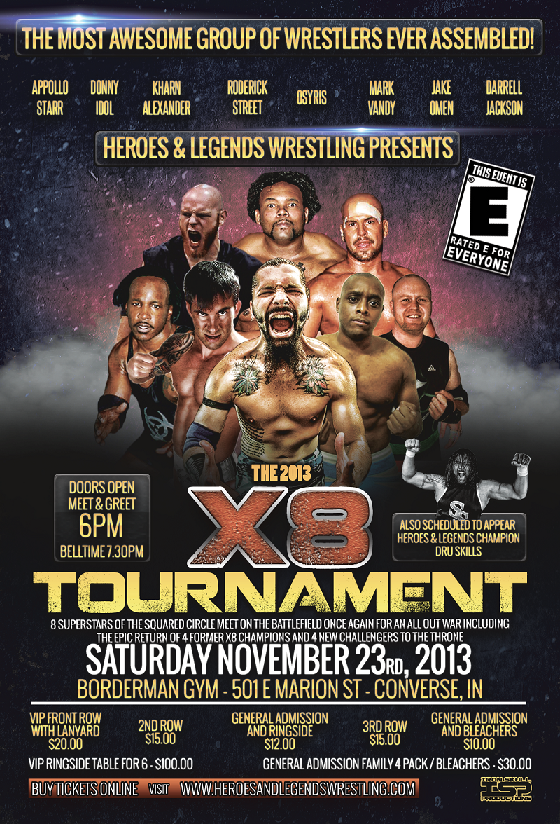Saturday, November 23, 20132013 X8 Tournament Borderman Gym * Troy Miller w/ Miss E-Liz beat Joseph Schwartz First Round: * Jake Omen beat Donny Idol * Osyris beat Roderick Street * Mark Vandy beat "Poison" Appollo Starr * Kharn Alexander w/ Kenzi beat Darrell Jackson 2nd Round: * Jake Omen beat Kharn Alexander * Mark Vandy beat Osyris * HLW Championship: Dru Skillz (c) beat Christopher Steele by submission Finals * Mark Vandy beat Jake Omen to become the 2013 X8 Champion