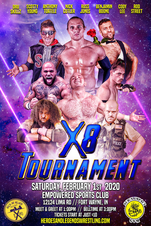 Heroes & Legends 2020 X8 Tournament Saturday, February 1, 2020 Empowered Sports Club 12124 Lima Road Fort Wayne, IN 46818 First Round Matches: * HLW Champion Anthony Toatele beat Scotty Young * Russ Jones beat HLW Cruiserweight Champion Cody Lee * Nick Cutler beat Benjamine Boone * HLW Legends Champion Dru Sklliz beat Office Rod Street Non- tournament matches: * Hot Country beat War Hoss in a tag team match * Jorge Bravo beat Alexander S. Kirk Second Round Matches: * Russ Jones beat Dru Skillz * Anthony Toatele beat Nick Cutler Final Round: * Anthony Toatele beat Russ Jones to become the X8 Champion